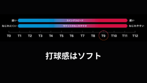 軽快なスピード系ラケットほど弾きは速くないですが、シャトルが面にしっかり乗る感覚(T9)があります。